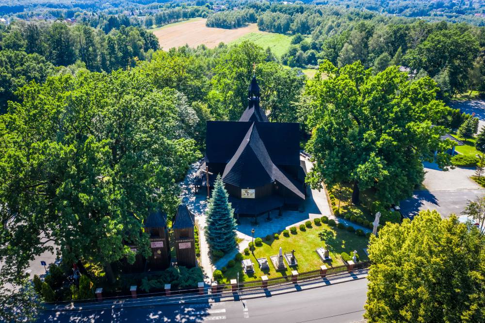 Kościół jest orientowany, zbudowany na zrąb; nie posiada wieży. Rzadko spotykanym rozwiązaniem jest plan krzyża greckiego, czyli równoramiennego. Dach jest kryty gontem, dwuspadowy, od strony zachodniej naczółkowy. Sygnaturka ma kształt latarni przykrytej hełmem. Obiegające kościół soboty wykonano prawdopodobnie w XVIII wieku. Na jednej ze ścian zewnętrznych zawieszono obraz przedstawiający wspomnianego ks. Walentego na koniu, ukrywającego w dziupli bursę. W tle widać goniących go husytów. Niestety nie zachował się pierwotny wystrój wnętrza. XVIII-wiecznego pochodzenia są: obraz Wniebowstąpienia Pańskiego oraz kamienna chrzcielnica. Resztę wyposażenia wykonano w XIX lub XX wieku.