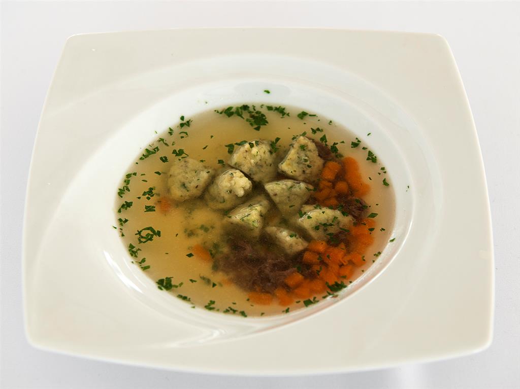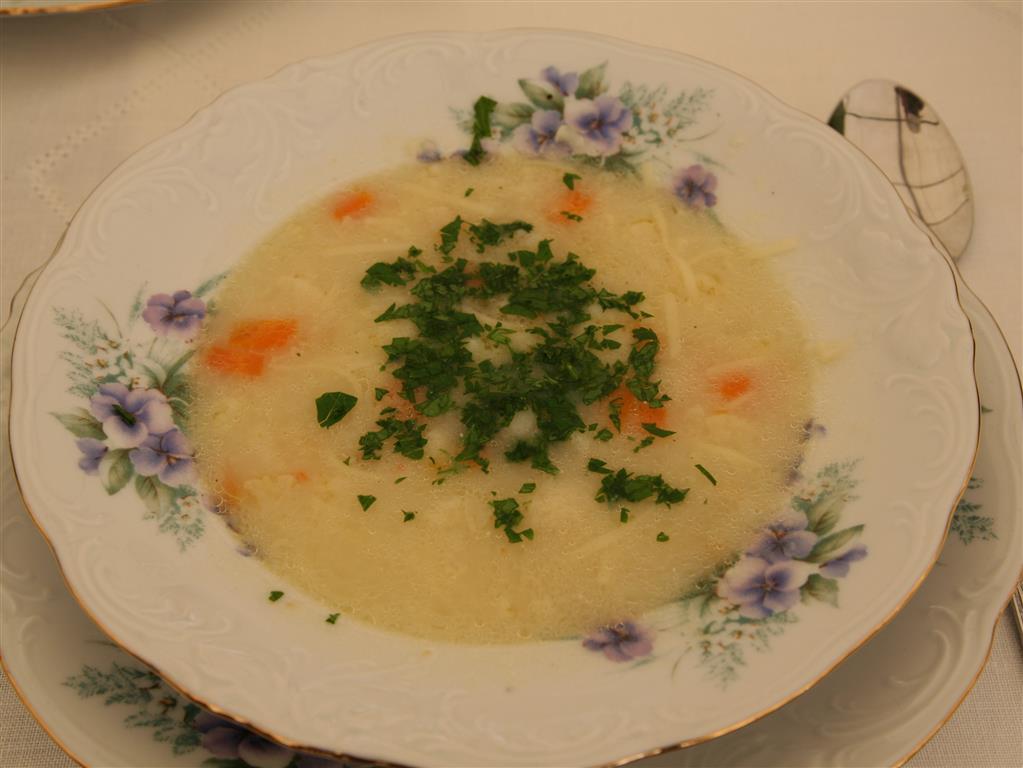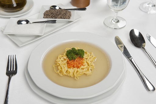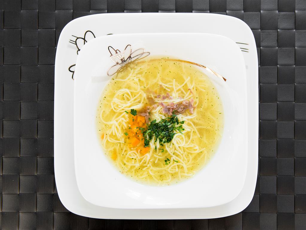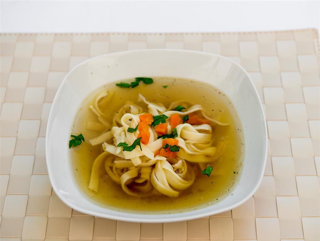 Rosół wołowo-drobiowy z makaronem i podrobami.
