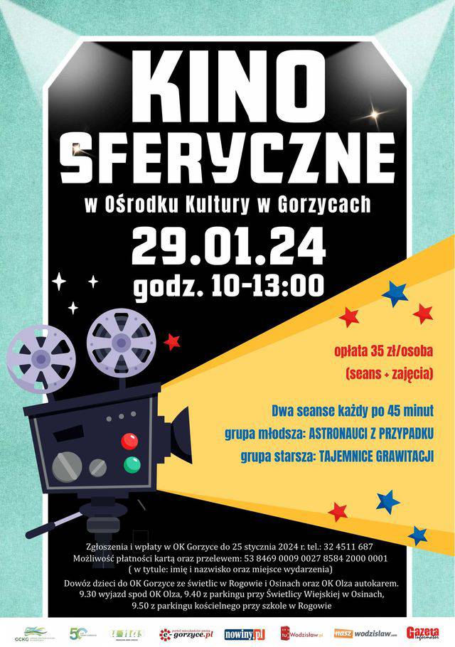 W 29 stycznia w Ośrodku Kultury w Gorzycach przy ulicy Mikołaja Kopernika 8 w Gorzycach odbędzie się seans KINA SFERYCZNEGO wraz z zajęciami. Kino i zajęcia zaczną się od godziny 10:00 i potrwają do godziny 13:00. Zaplanowano dwa seanse, każde po 45 minut dla dwóch grup wiekowych: grupa młodsza temat: Astronauci z przypadku. Grupa starsza temat: Tajemnice Grawitacji. Wydarzenie jest płatne- 35 złoty od osoby, szczegóły znajdują się na plakacie poniżej lub kontakt telefoniczny 32 4511 687. Serdecznie zapraszamy.