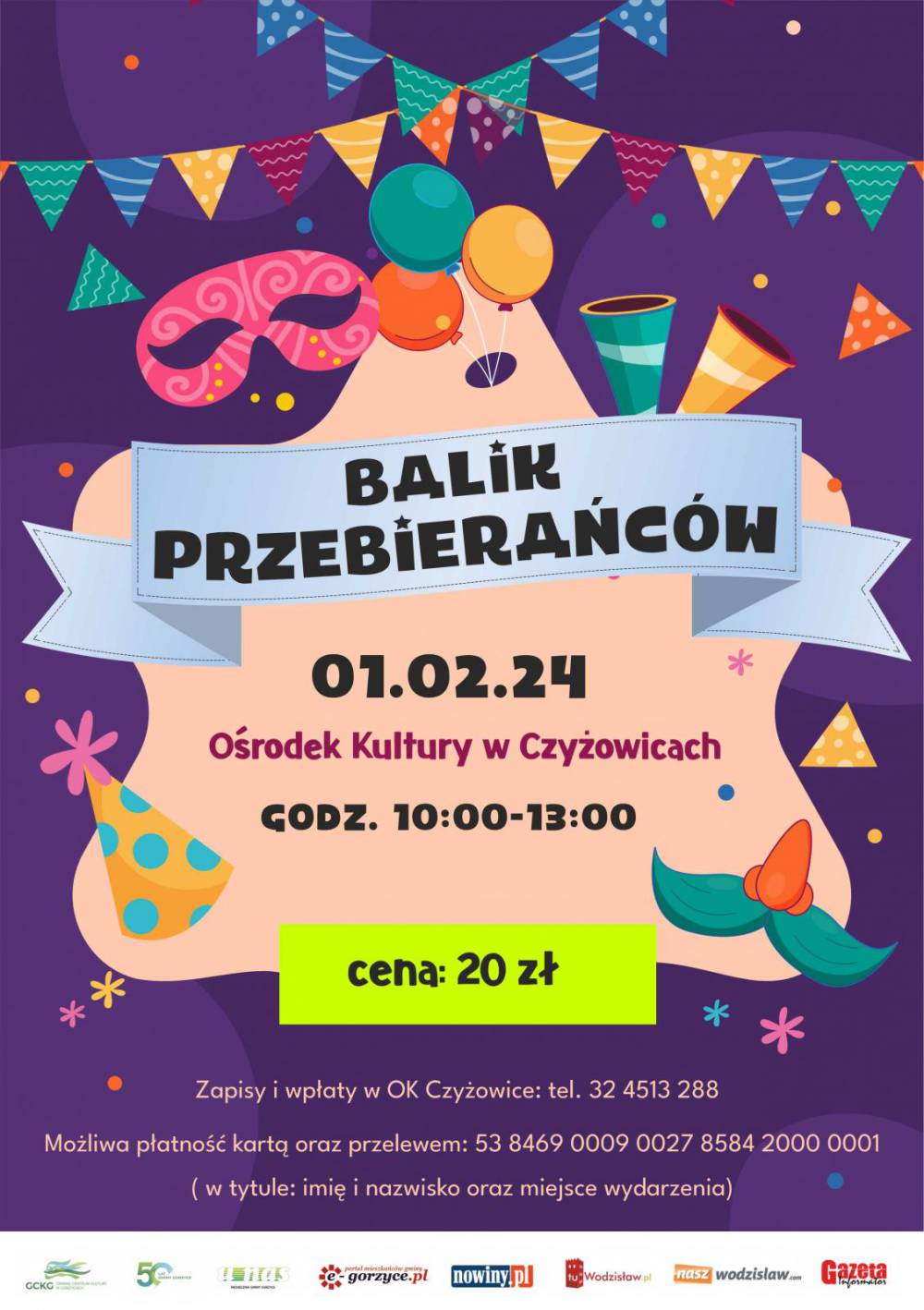 W 1 lutego 2024 roku zapraszamy dzieci na Balik Przebierańców, który odbędzie się w Ośrodku Kultury w Czyżowicach od godziny 10:00-13:00. Zapraszamy dzieci do zabawy karnawałowej. Liczy się kreatywność i dobry humor. Wejście płatne 20 zł za osobę. Zapisy i wpłaty w Ośrodku Kultury w Czyżowicach. Szczegóły na plakacie poniżej lub kontakt telefoniczny 32 4513 288.