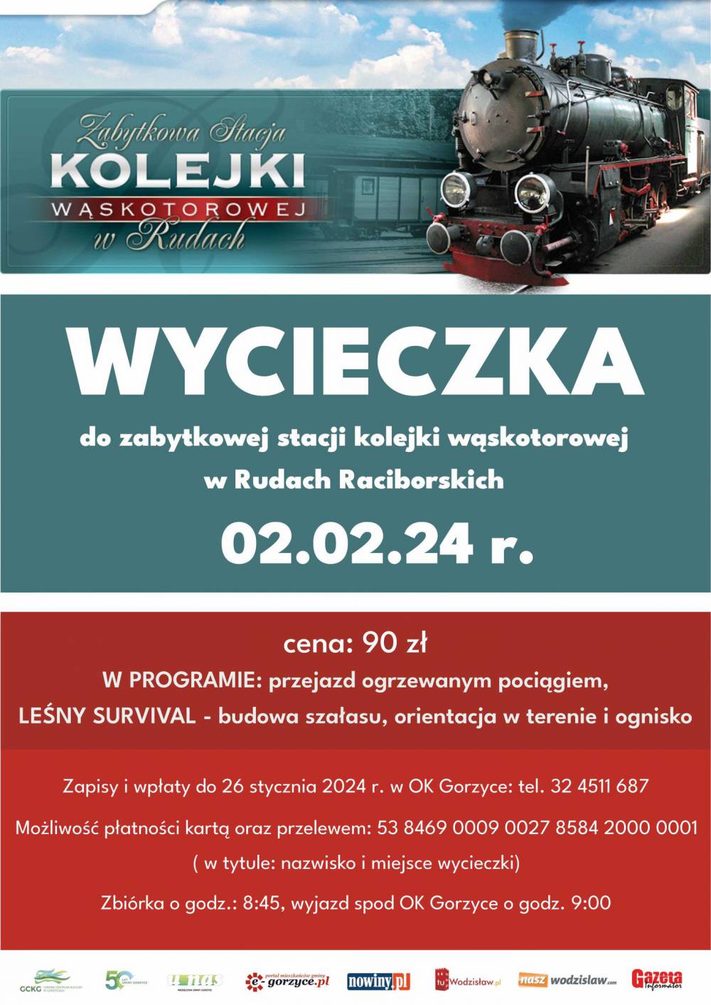 W 2 lutego Gminny Ośrodek Kultury zaprasza na Wycieczkę do Zabytkowej Stacji Kolejki Wąskotorowej w Rudach. W programie wyjazdu zaplanowano: Przejażdżkę z składem kolejki wąskotorowej z parowozem na czele, warsztaty z leśnego survivalu, budowa szałasu, zajęcia orientacji z terenie oraz wspólne ognisko dla uczestników. Koszt wyjazdu 90 zł. Zapisy i wpłaty do 26 stycznia. Więcej szczegółów na plakacie poniżej lub kontakt tel. 32 4511 687.