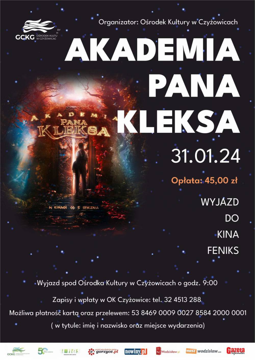 Gminy Ośrodek Kultury zaprasza na wyjazd do Kina Feniks w Rydułtowach, znajdującego się w budynku Rydułtowskiego Centrum Kultury na seans filmu Akademia Pana Kleksa. Wyjazd spod Ośrodka Kultury w Czyżowicach w 31 stycznia o godzinie 9:00. Koszt transportu i seansu kinowego to 45 zł od osoby. Zapraszamy na uwspółcześnioną wersję klasycznej bajki Jana Brzechwy. Więcej informacji na plakacie poniżej lub kontakt tel. 32 4513 88.