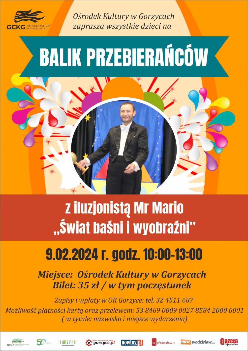 Zapraszamy na Balik Przebierańców z Iluzjonistą mr. Mario. Balik przebierańców odbędzie się 9 lutego w Ośrodku Kultury w Gorzycach. Wstęp płatny 35 zł za osobę. W programie wydarzenia zaplanowano poczęstunek. Więcej szczegółów na plakacie poniżej lub kontakt tel. 32 4511 687