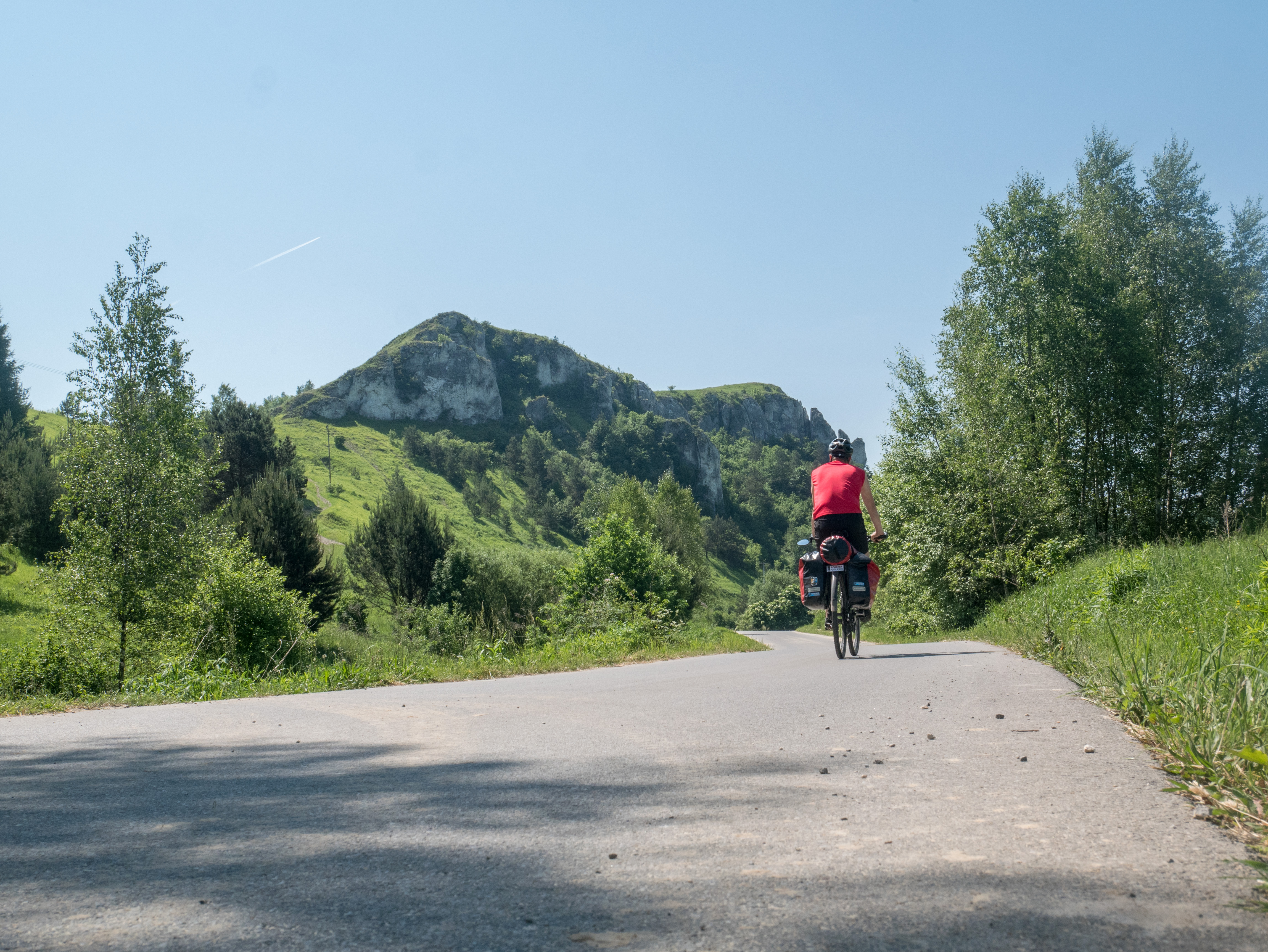 rowerze a nawet konno. Przebiega przez niezwykle malownicze tereny województwa śląskiego i małopolskiego, rozpoczyna się w Częstochowie, a kończy w Krakowie, choć oczywiście można go przejechać w dowolnym kierunku. Wariant rowerowy tego szlaku liczy ok. 190 km i umożliwia poznanie z wysokości rowerowego siodełka najpiękniejszych zakątków Jury. Jura Krakowsko-Częstochowska to region, który charakteryzuje się pagórkowatą rzeźbą terenu, więc wybierając ją jako cel rowerowej wyprawy trzeba liczyć się z licznymi podjazdami i rekompensującymi je zjazdami, w zamian za to możemy cieszyć się zachwycającym krajobrazem, w którym wśród lasów i zieleni nasze oczy cieszyć będzie widok niezliczonych białych jurajskich ostańców o wyjątkowych kształtach