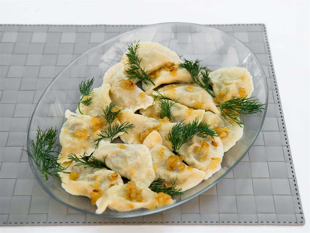 Przygotować farsz: grzyby namoczyć na 12 godzin w słodkim mleku. Następnie ugotować w osolonej wodzie, ostudzić i drobno pokroić. Grzyby zesmażyć z posiekaną cebulą, doprawić solą i pieprzem. Przygotować ciasto: mąkę uformować w stożek z wgłębieniem pośrodku. Wlać do niego olej i wodę, powoli zarabiając. Kiedy powstanie spoista masa, wyrabiać ciasto tak długo, aż będzie gładkie i elastyczne.