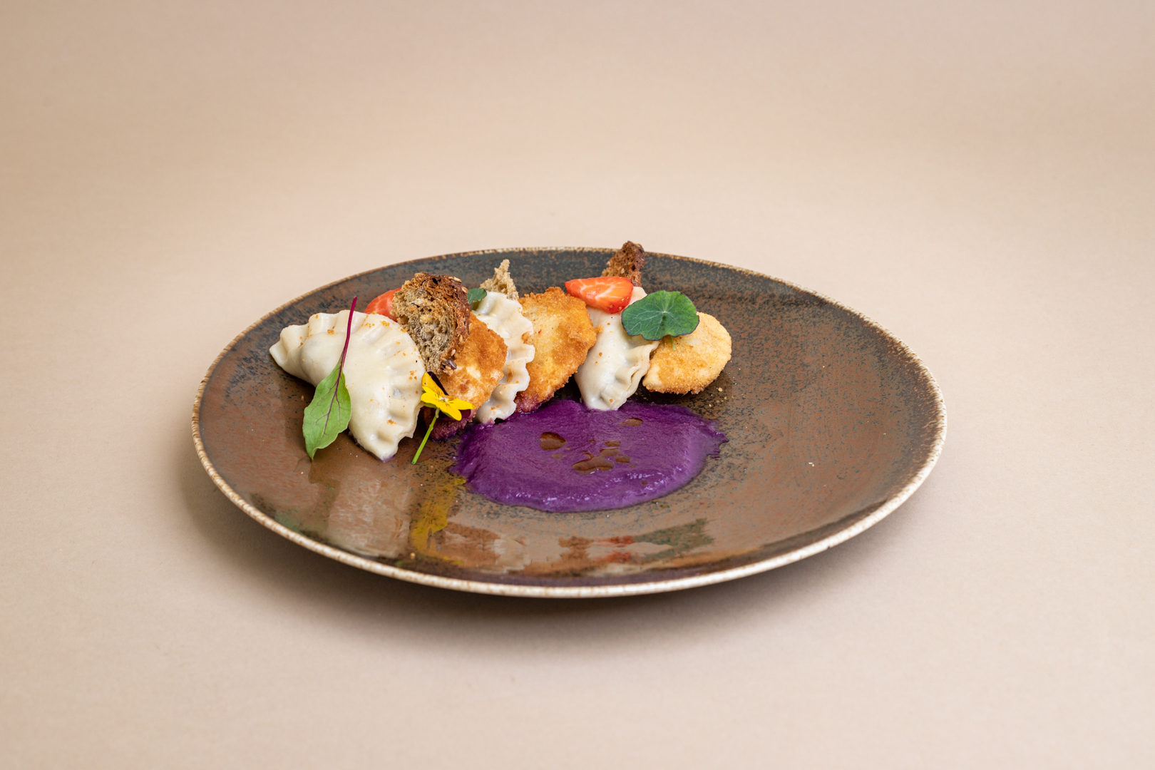 Ziemniaki obrać, ugotować do miękkości. Boczek pokroić na drobną kostkę i podsmażyć na suchej patelni. Kapustę obgotować i dodać 2 ziela angielskie i 1 liść laurowy. Kapustę i ziemniaki dodać do podsmażonego boczku. Przyprawić solą i pieprzem. Do mąki dolać 100g wrzącej wody, 10g oleju i szczyptę soli. Wyrobić ciasto, przykryć folią i odstawić na chwilę. Cebulę obrać, pokroić w kostkę i podsmażyć na łyżce oleju. Krupniok obrać ze skóry, rozdrobnić i dodać na patelnie. Przyprawić sola i pieprzem do smaku. Ciasto na pierogi rozwałkować i wyciąć kółka. Połowę kółek nafaszerować panczkrautem, a resztę krupniokiem z cebulą. Uformować pierogi. Pierogi z panczkrautem opanierować w jajku i bułce tartej, usmażyć na głębokim tłuszczu. Pierogi z krupniokiem ugotować we wrzącej i osolonej wodzie.