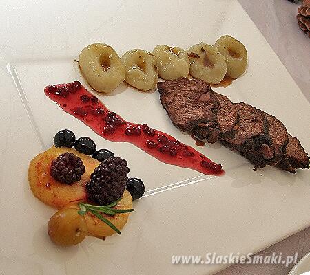 Polędwicę układamy na sosie borówkowym z porcją duszonych jabłek i czarnymi kluskami, polanymi tłuszczem spod mięsa (w tradycyjnej kuchni śląskiej sosem polewamy kluski, a nie mięso, ale w tym przypadku jest to kuchnia dworska, więc sos trafia pod mięso, a kluski musimy omaścić, by nie były suche i gładko przechodziły przez gardło). Całość dekorujemy ostrężnicami, brusznicami i ziołami.
