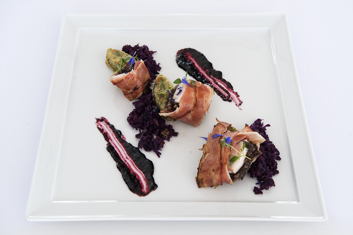 Comber zamarynować w oliwie, czosnku i tymianku. Kaszankę podgrzać na patelni, dodać śmietanę, tymianek, doprawić. Boczek rozłożyć, ułożyć comber, kaszankę, zawinąć, obsmażyć, włożyć do piekarnika na ok. 15 min. w 180oC. Zawinąć do folii, przetrzymać ok. 10 min.