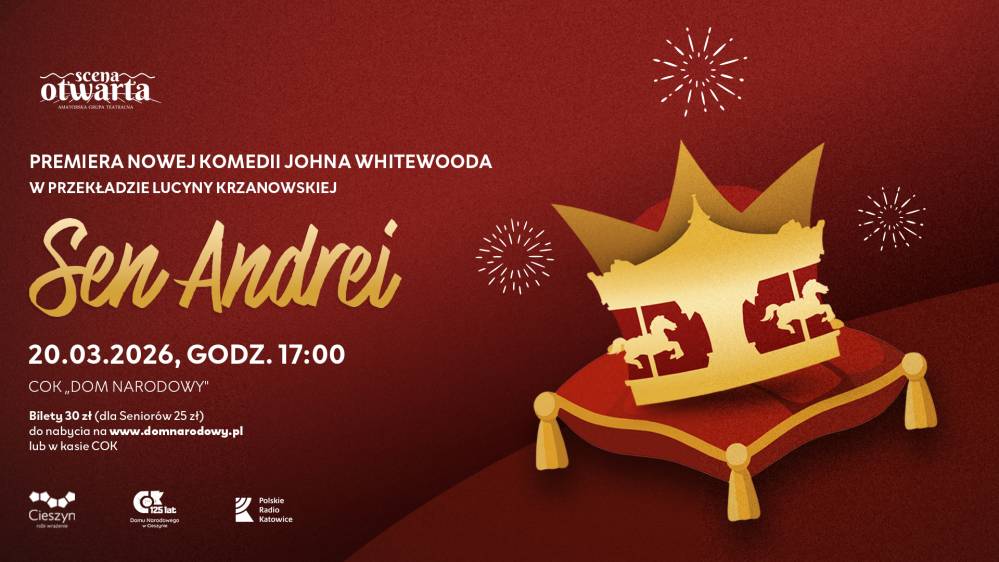 Cieszyński Ośrodek Kultury „Dom Narodowy” zaprasza na premierę spektaklu Johna Whitewooda pt. „Sen Andrei” w tłumaczeniu Lucyny Krzanowskiej. Przedstawienie w wykonaniu grupy teatralnej Scena Otwarta odbędzie się 20 marca o godz. 17:00 w Domu Narodowym w Cieszynie.
