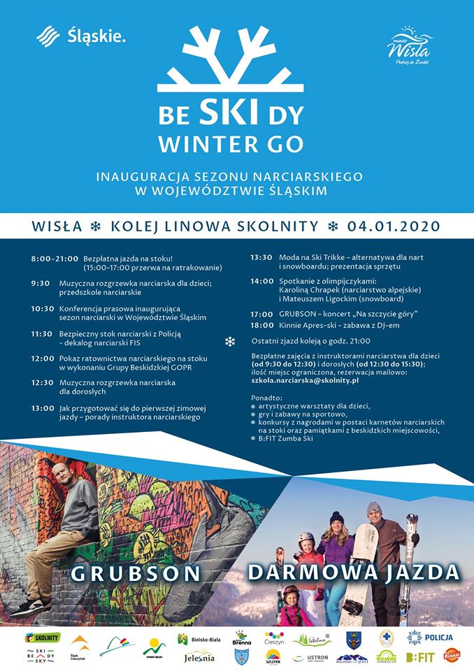 Już na początku 2020 roku po raz pierwszy w historii odbędzie się wojewódzka inauguracja sezonu narciarskiego. W Wiśle będzie można pojeździć za darmo, wziąć udział w imprezie apress-ski i posłuchać koncertu GrubSona. To wszystko już 4 stycznia na górnej stacji kolei linowej Skolnity w centrum Wisły w ramach wydarzenia BeSKIdy Winter Go.